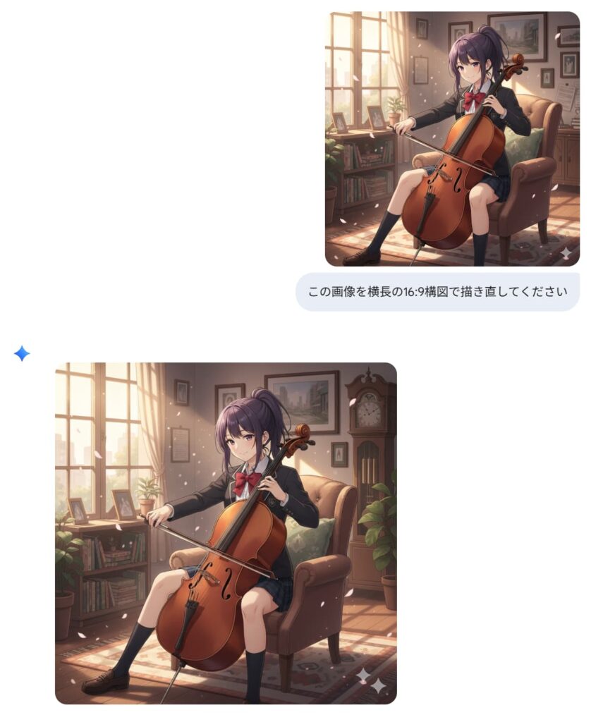 正方形の画像を横長の画像に変更したい場合、チャットで横長の構図に変更指示を与えても指示は伝わらず、正方形の構図が維持されてしまいます。