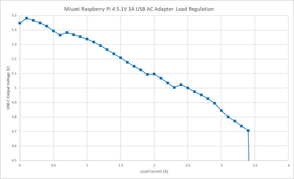 負荷電流の変化に対して、USB-C 出力電圧はジグザグ状に変化します。負荷電流が増加すると、出力電圧はジグザグ状に減少する傾向があり、変動幅は比較的大きい印象です。