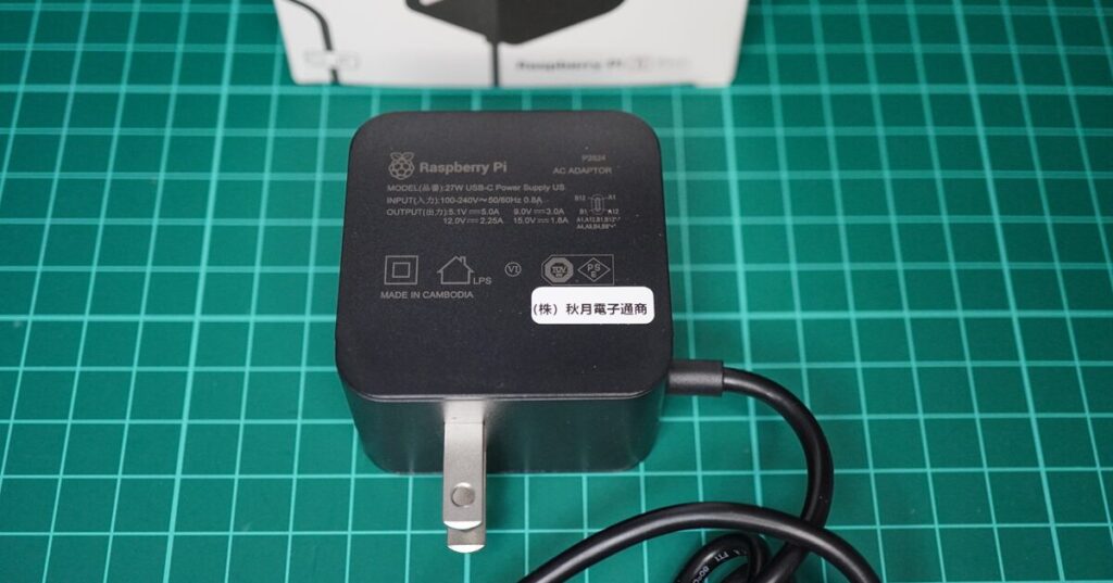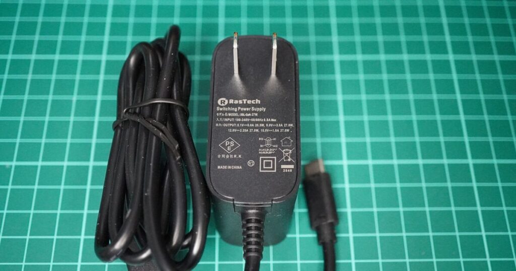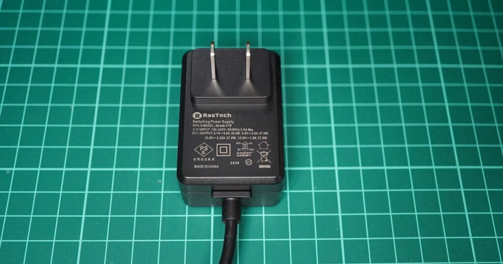 Raspberry Pi 5の消費電力に対応するよう設計されているACアダプターで、GaN(窒化ガリウム)技術を採用し、小型・高効率を実現しています。USB PD(Power Delivery)に対応しています。