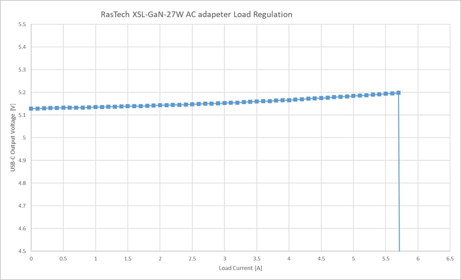 負荷電流の変化に対して、USB-C 出力電圧はほとんど変化しません。負荷電流が増加すると、出力電圧はわずかですがほぼリニアに増加する傾向があります。
