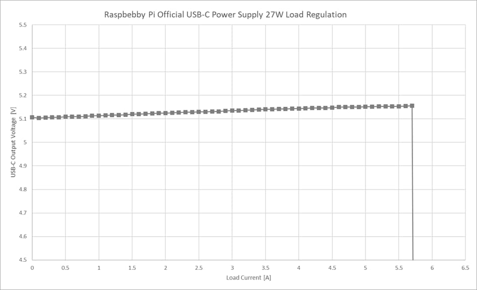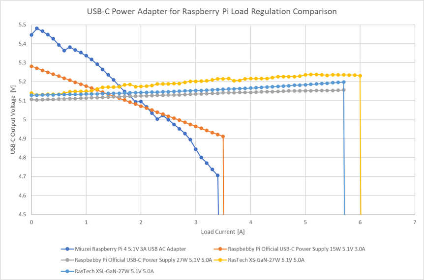 Raspberry Pi 4向けの 5.1V/3A 電源は右肩下がりの特性を示し、Raspberry Pi 5向けの 5.1V/5A 電源はわずかに右肩上がりの特性となっています。