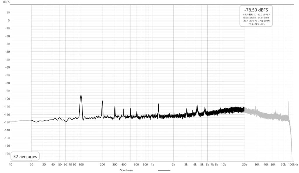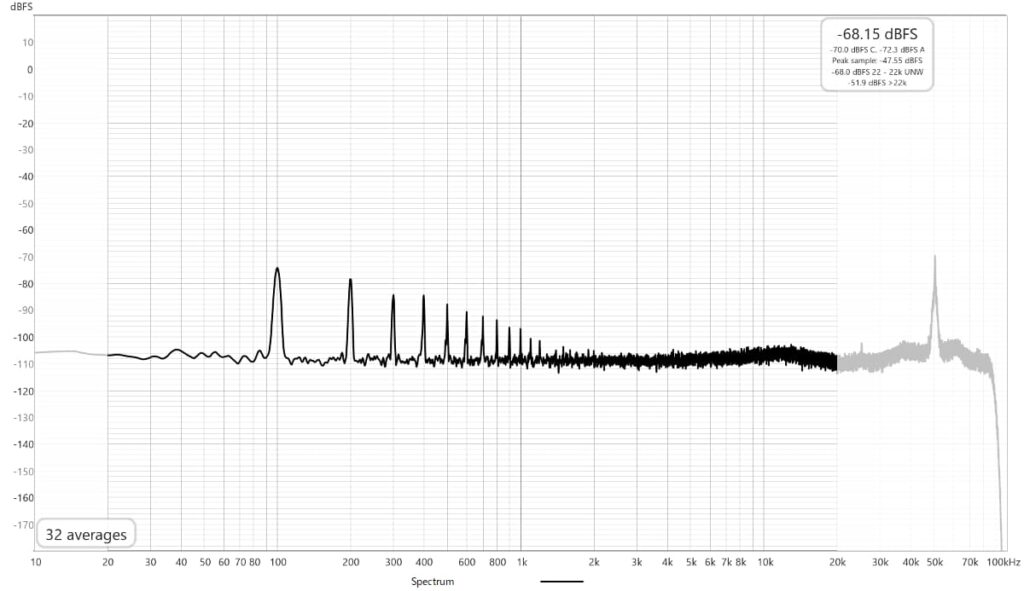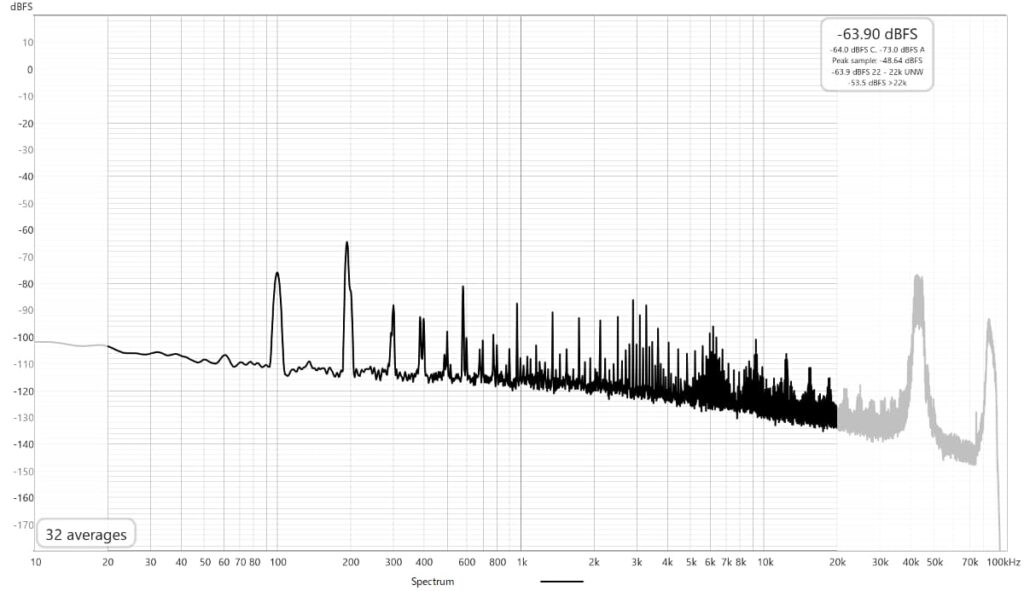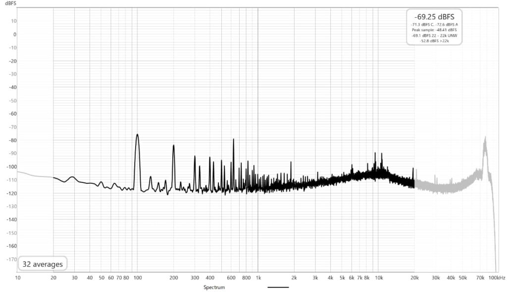 スイッチング周波数は70数kHz?、ノイズレベルは全般的にやや低めですが100Hzの高調波が全域に広がっているように見え、10kHz辺りに少し山があります。
