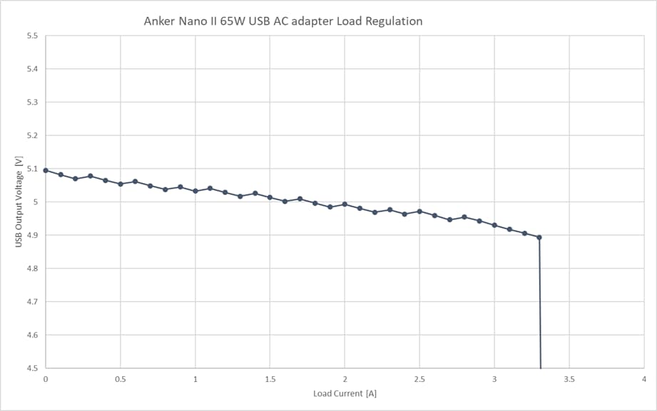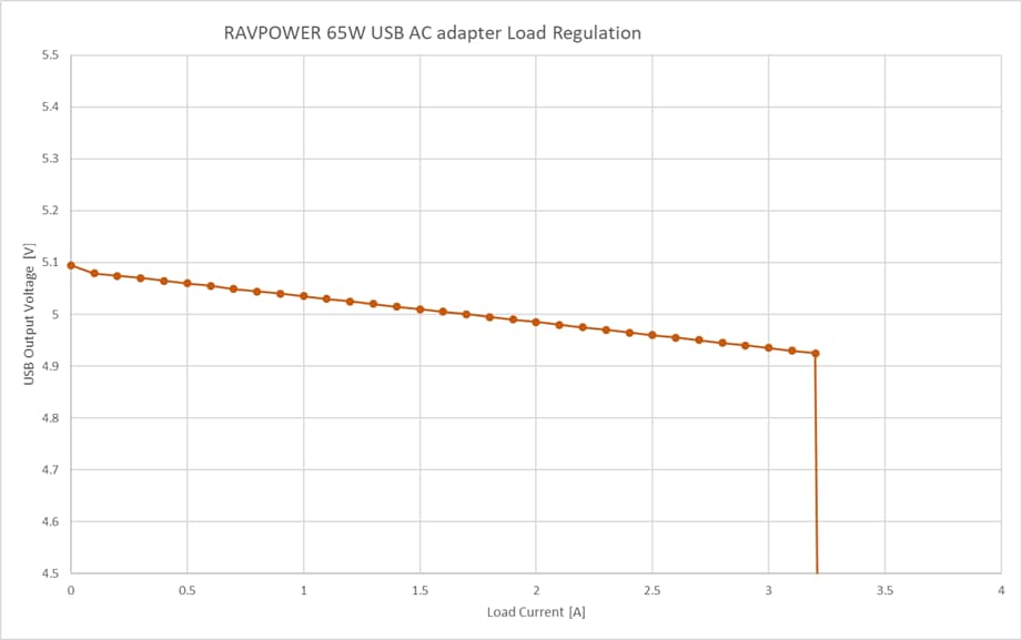 定格 5V 3Aに対し、3.2Aを超えると過電流保護が働き出力を停止しています。