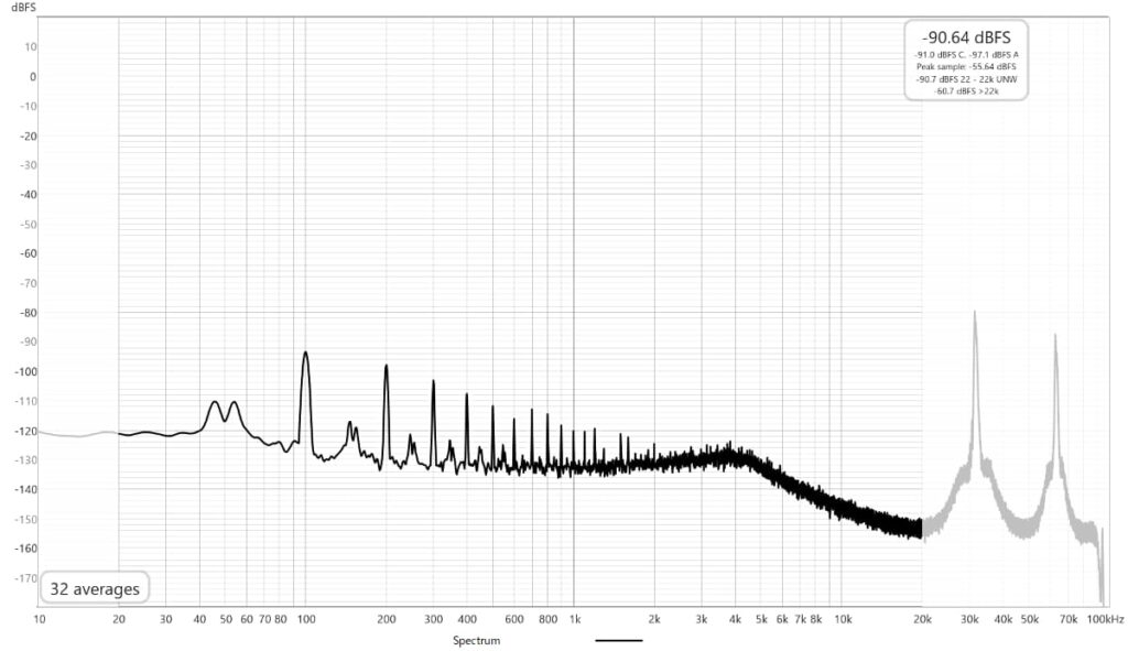 GaN搭載によりスイッチング周波数は40数kHzと高くなっています。ノイズレベルは全般的に周波数が高くなるに従い下がる傾向ですが100Hzの高調波が全域に広がっているように見えます。