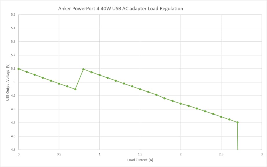 定格 5V 2.4Aに対し、2.7Aを超えると過電流保護が働き出力を停止しています。