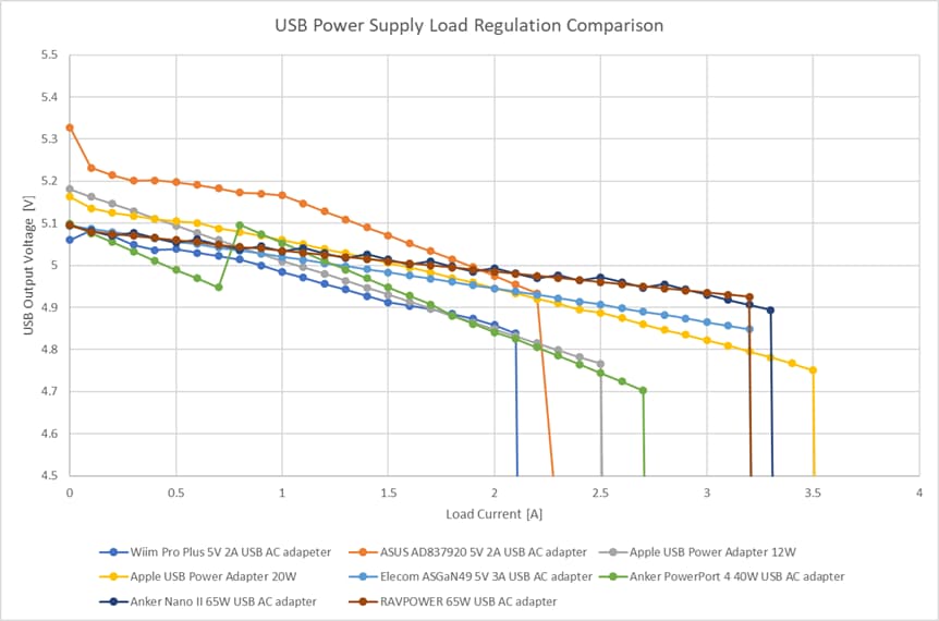 グラフが全体に右肩下がりなのは、USBケーブルの抵抗による電圧降下と各USB電源アダプターの特性によるものです(USBケーブルは、TypeA/C: HOTRON E246588 USB3.1 ケーブル長1m、TypeC/C: E344977-Q USB3.1 ケーブル長1m)