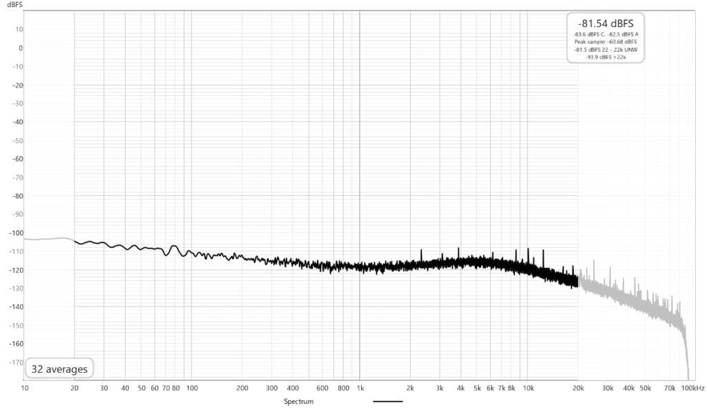 スイッチング周波数は判別できません。ノイズレベルは全般的に低めですが、周波数が高くなるに従い上がる傾向です。100Hzの高調波がわずかに広がっているように見え、10~20kHz辺りに少し山があります。